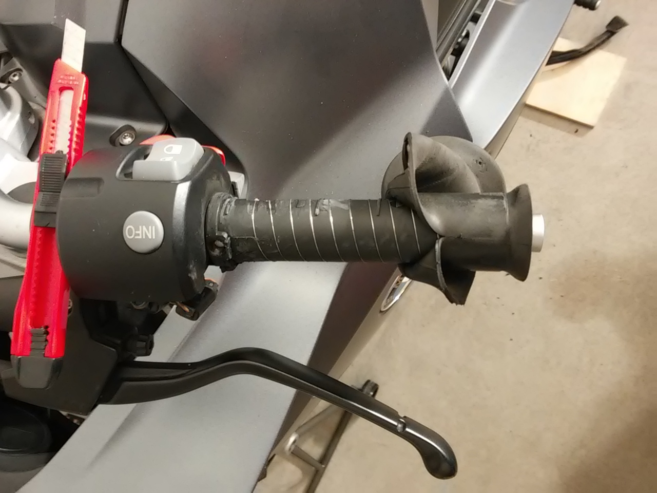 Hier der Griff mit abgezogenenm Griffgummi. Das Abziehen ist relativ einfach, wenn der Gummi ganz durchgeschnitten ist, bei mir war er - wahrscheinlich durch die Nutzung der Heizung - auf der ganzen Fläche angeheftet, aber klebt nicht zu stark. Beim Schneiden vorsichtig, dass die Heizdrähte nicht verletzt werden, da sie aber in einer Nut laufen ist das bei etwas Vorsicht kein Problem.