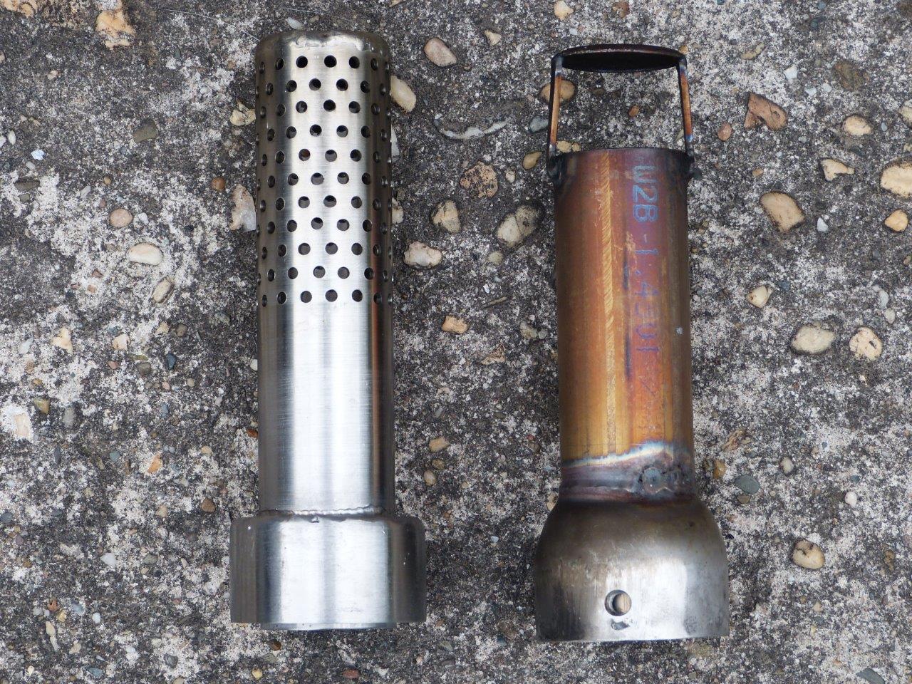 Ich dachte, mit mehr Verwibelung der Luft müsste der ESD doch leiser werden. Ein gelochtes Rohr sollte den ESD doch leiser machen. Eine Anfrage bei meinem Bruder (er schweißt mir immer Kleinteile aus Edelstahl) war erfolgreich. Er hatte mir die Rohrstücke besorgt und zusammengeschweißt. Die Löcher habe ich dann selbst gebohrt. Für die Klemmschraube habe ich das Gewinde direkt in das Rohr geschnitten, da es mit 2mm recht dick ist. Ich habe als Gesamtquerschnitt der Löcher ca. 35% mehr als den Querschnitt des Endrohrs verwendet wegen des erhöhten Strömungswiderstandes im Randbereich. Der Durchmesser der Löcher ist 3mm.