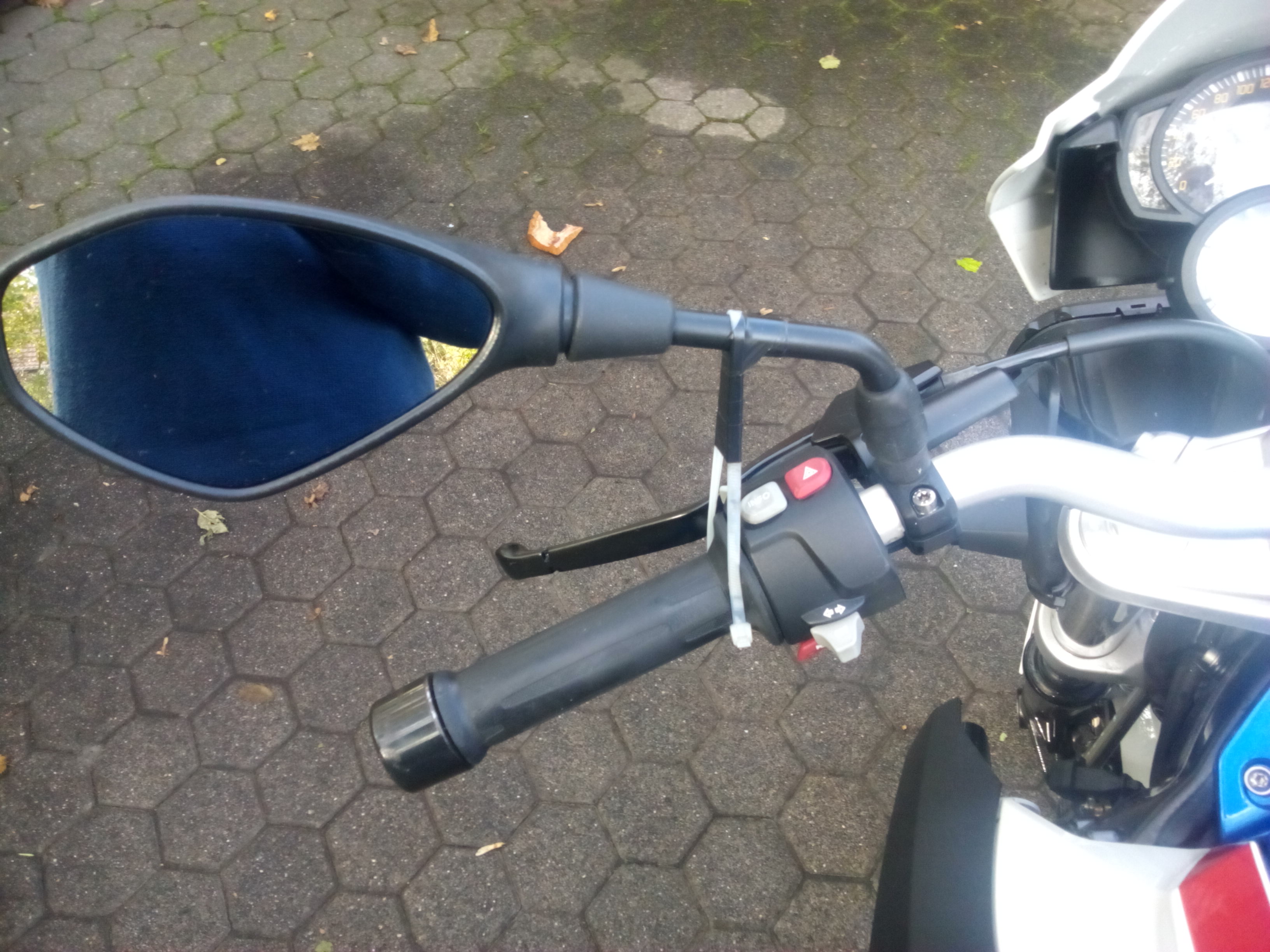 Am linken Spiegel hatte ich bei der ersten Autobahnrast einen Kabelbinder angebracht weil ich die nachfolgenden 5 Bikerkollegen nur als verschwommene Objekte im stark vibrierenden Spiegel sah.