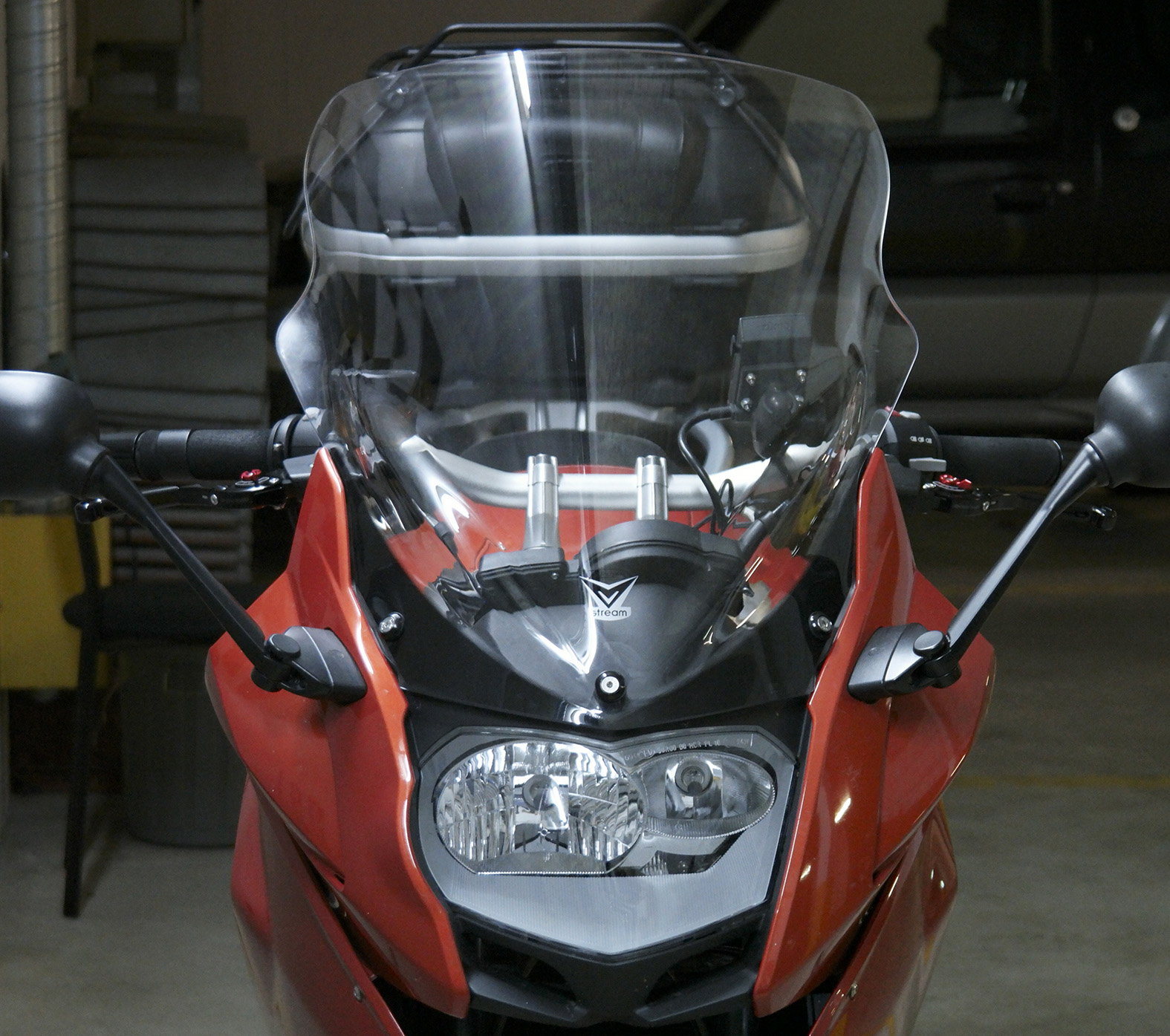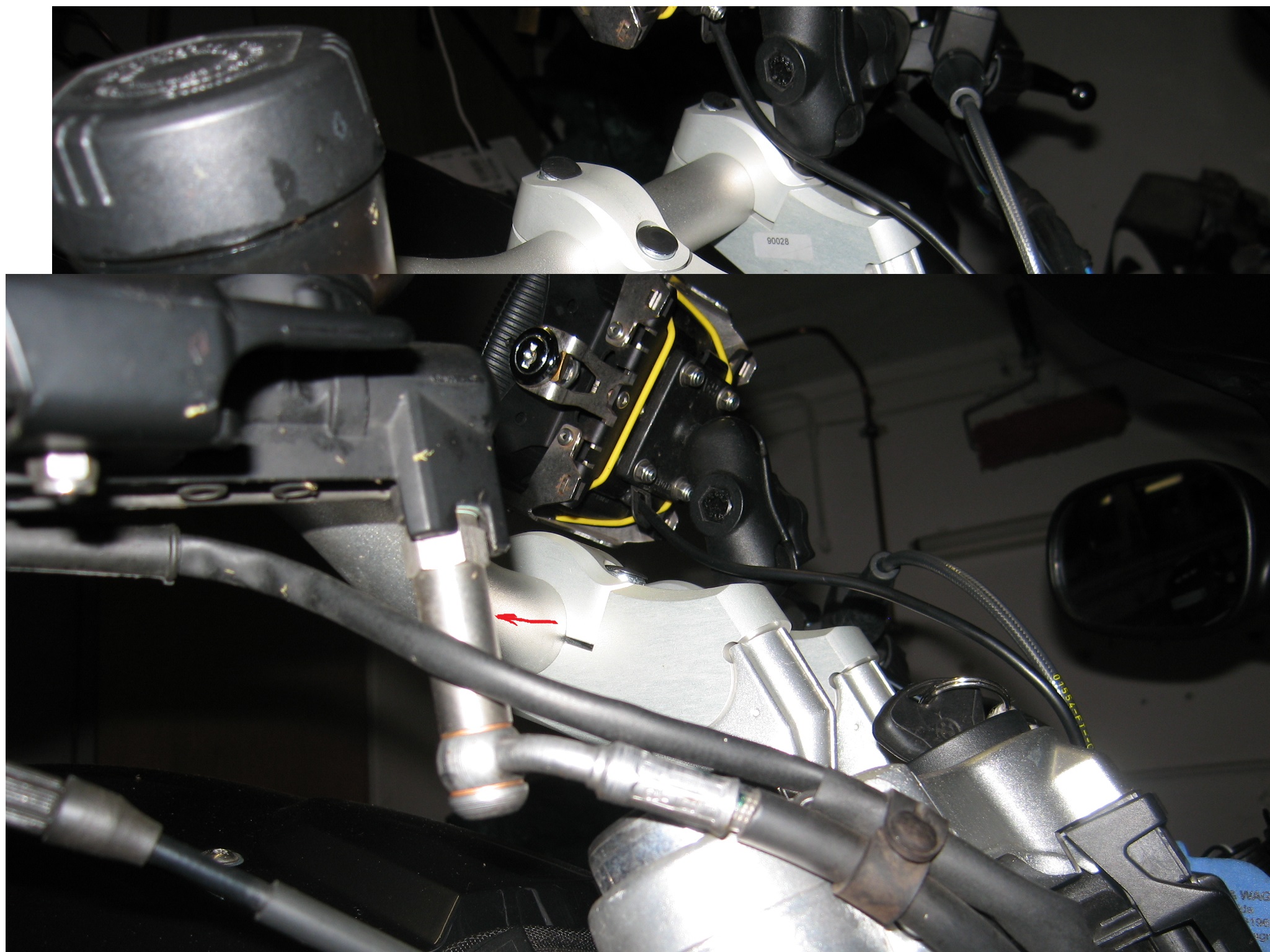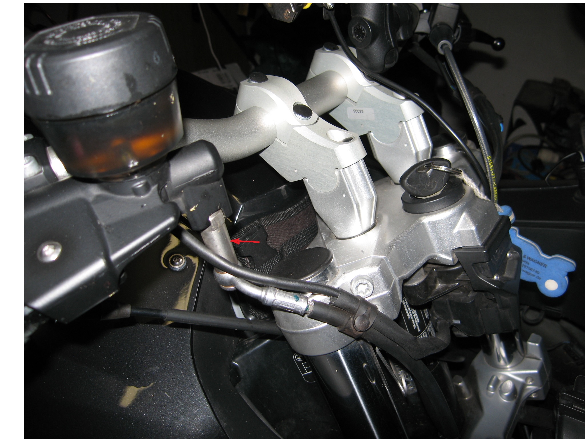 Habe die Leitung etwas verschoben / sortiert im Vorbau, dass kein Zug beim Lenken entstand wie - hier mit roten Punkten den Verlauf markiert. Bremsleitung ist aber etwas kurz um den Griff in der horizontalen zu höher kippen. Hat aber mit der V-Stream (hoch) Scheibe eh kein Platz mehr dafür. Hornig Fussrasten 25 mm, Motech Ganghebel, PUIG Hebel klappern mehr als die Chinesen in Orange! Batterie nun eine direkt Verbindung nach aussen, das Drecksding von der GS 1100 hat nicht geladen kein Canbus Signal. War gestern auf ner Tour ist alles super...
