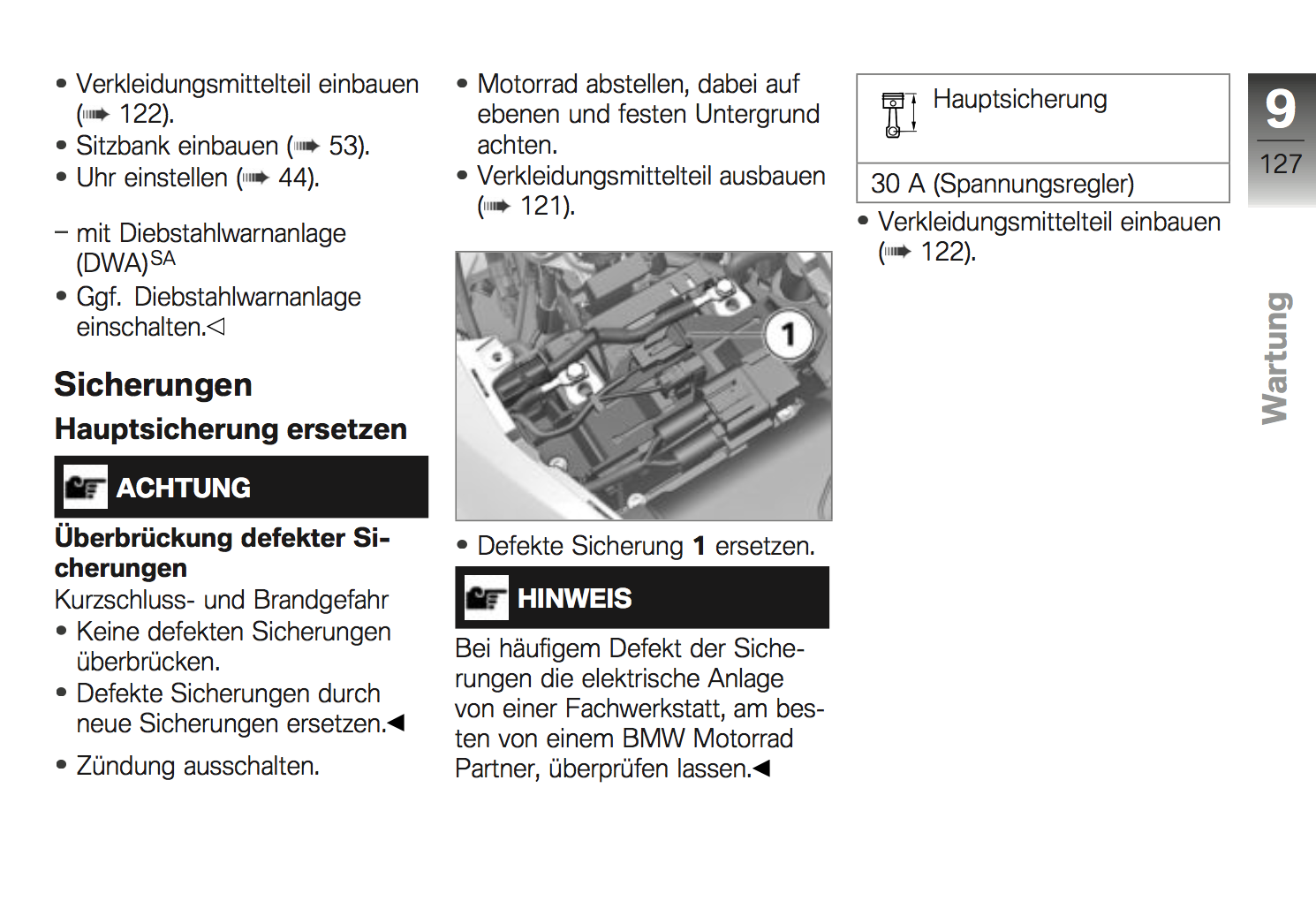 pogibonsi hat geschrieben:Bei meiner 700er GS sitzt die Hauptsicherung unter der Tankatrappe, über der Batterie. Bedienungsanleitung Seite 127.
