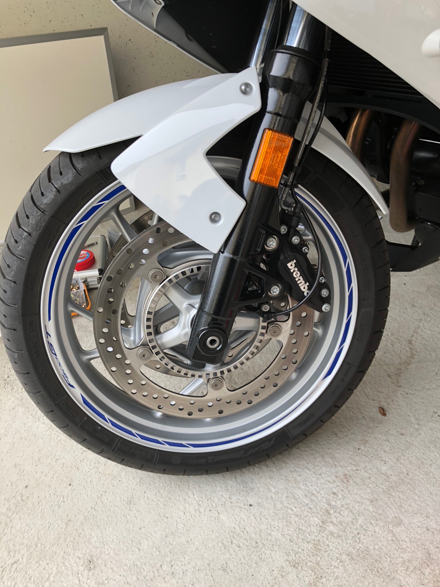 Da ich nach geschlagenen 2 Tagen auf der Suche nach einer Schriftart der F800GT versagt habe, habe ich das Original-Logo nachgebaut. Dass dann in Verbindung mit den neuen 120° Segmenten meiner Felgenaufkleber ergibt dieses das Resulatat 8)