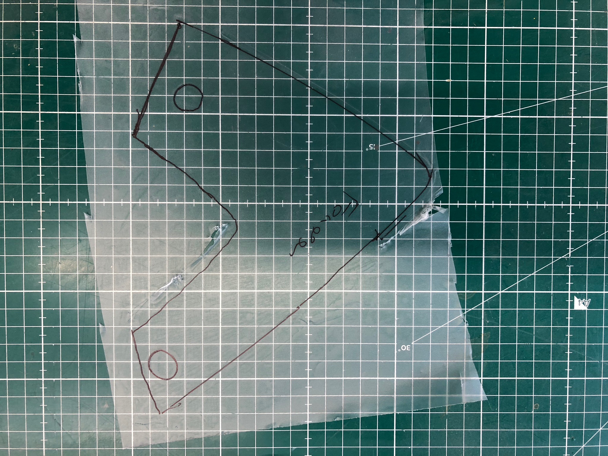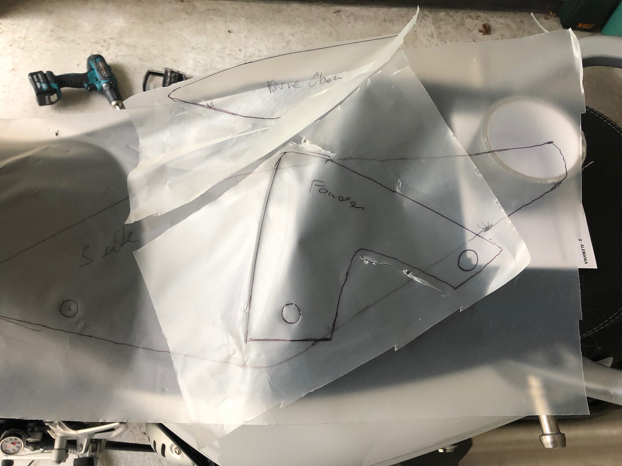 Also es gibt eine Transferfolie die man auf die geschnittenene Folie klebt. Diese Folie nehme ich her und klebe diese auf die entsprechenden Teile. Dann "male" ich die Konturen des Verkleidungsteils nach. Nach dem Ablösen der Folie klebe ich diese, mit der Skizze, auf eine Schneidmatte mit 10mm Raster. Ein Foto davon nehme ich als Hintergrund für Illustrator oder Fusion360 und baue die Geometrie nach.