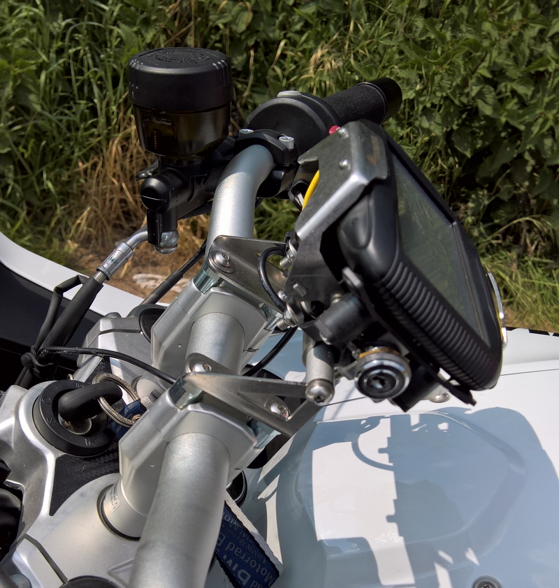 Den RAM Mount am Lenker finde ich nicht so schön, ich habe mein Garmin auf einer abschliessbaren Touratech Halterung