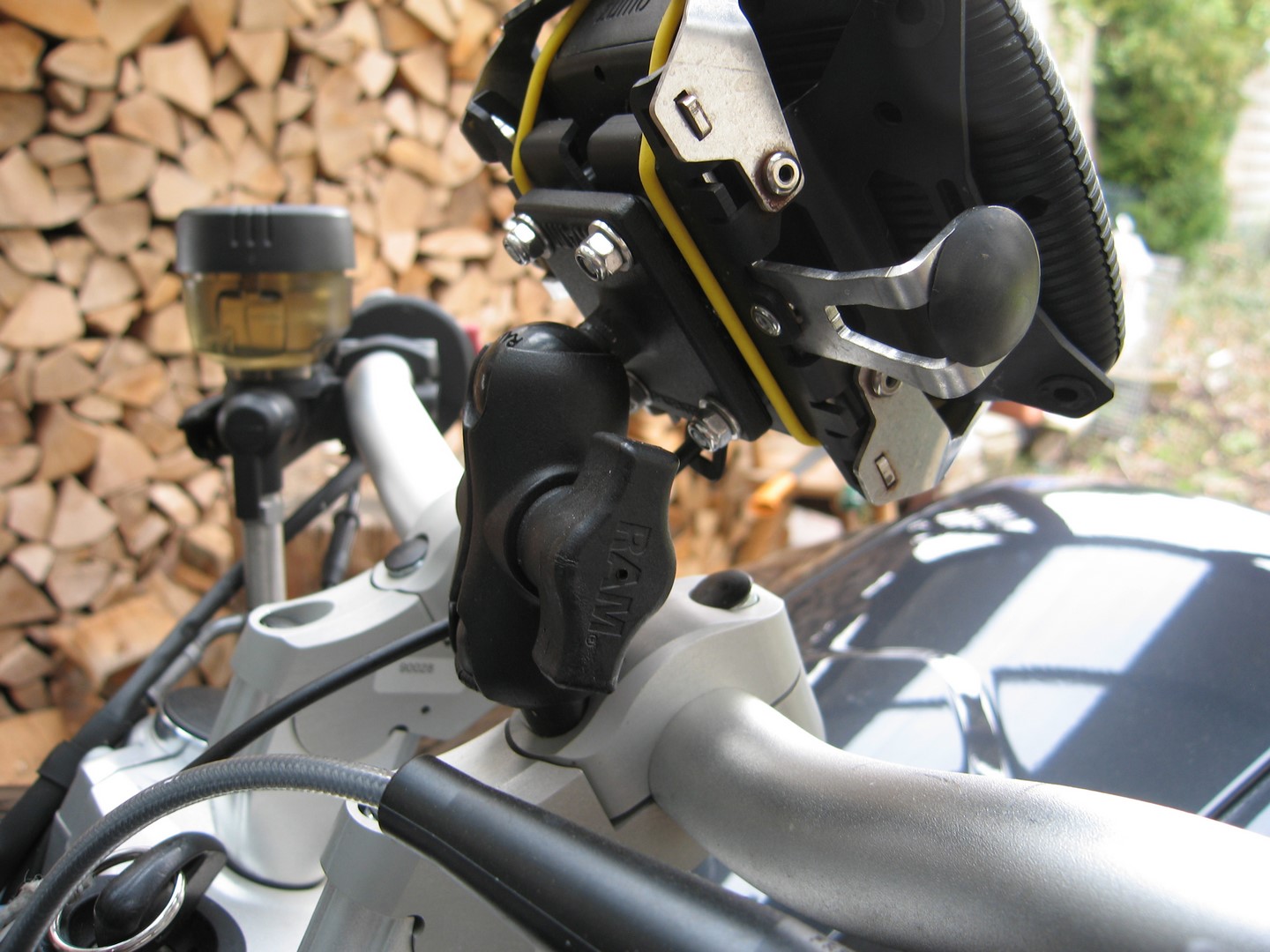 schau dir mal die Halterung von BMW Teilenummer 77528529421 bei Leebmann24.com an. Ich habe daran eine abschließbare Touratechhalterung für meinen Garmin Zumo396. Die BMW Halterung wird an den Schrauben der Lenkerklemmung befestigt und lässt sich verstellen.