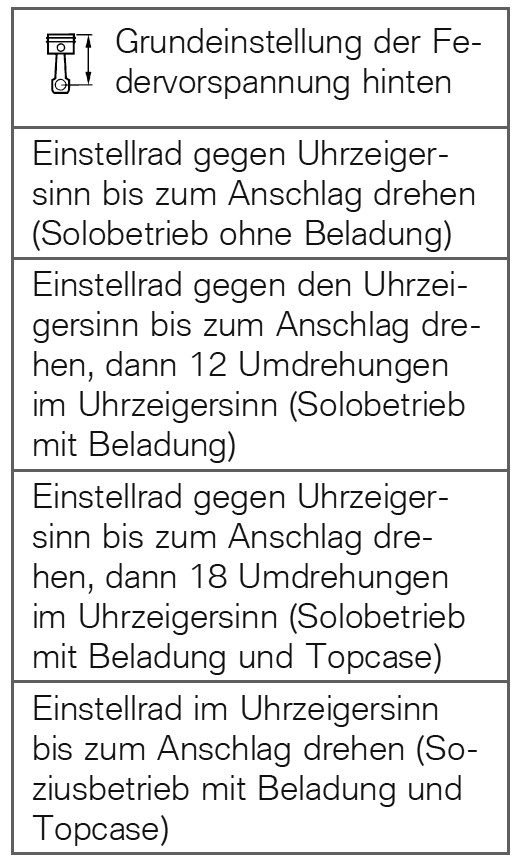 Andererseits scheint BMW ohnehin Probleme zu haben, die Einstellvorgaben für's Fahrwerk klar auszudrücken. Bei der NineT habe ich bei BMW interveniert und prompt wurde dann das Manual dahingehend geändert.