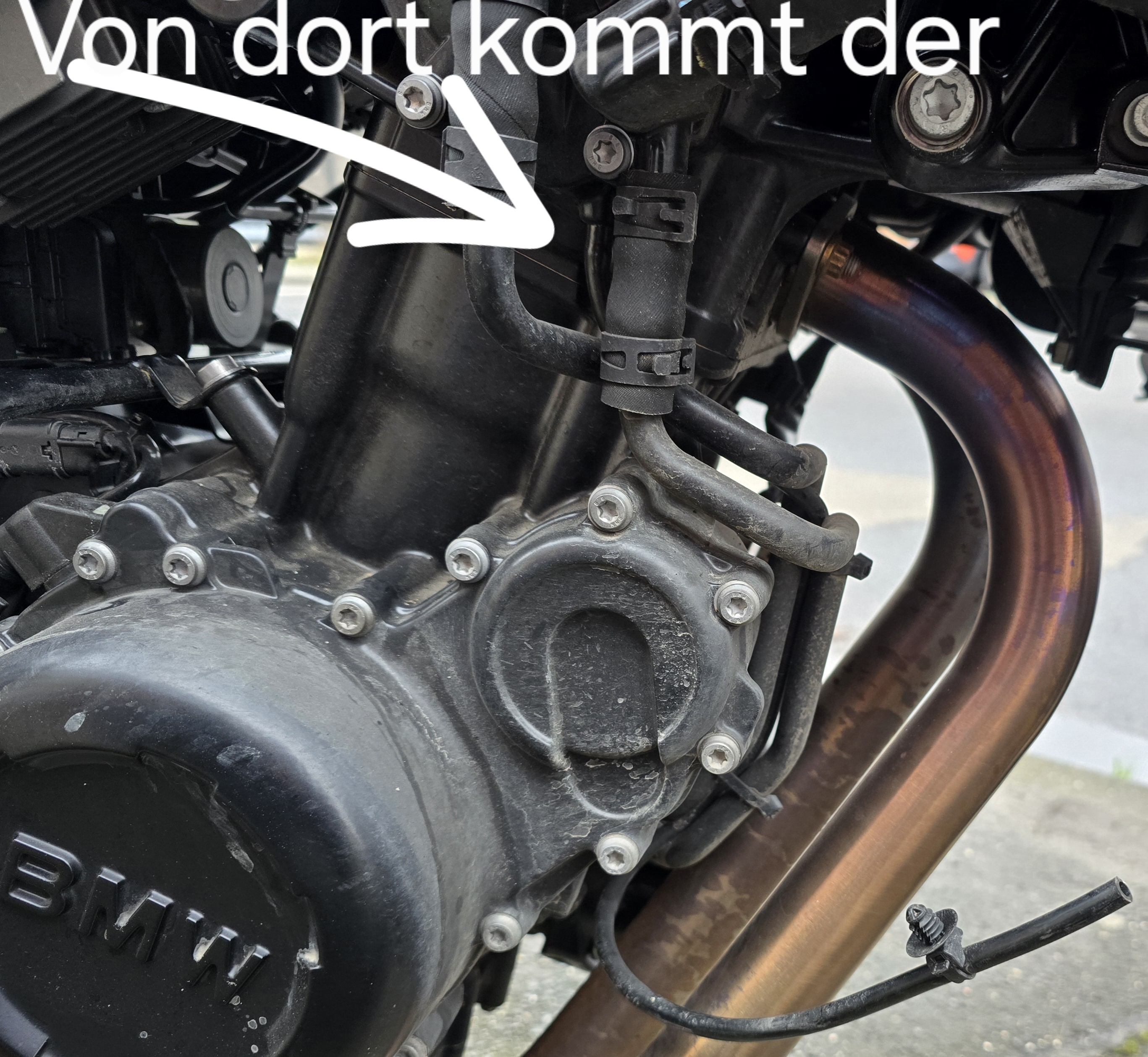 ich baue gerade meine Sturzpads an mein Motorrad. Dabei ist mir aufgefallen, dass hier ein Schlauch ist, der wohl nicht an seinem eigentlichen Platz ist. Dieser wurde einfach mit der Befestigung oben zwischen zwei Leitungen geklemmt.