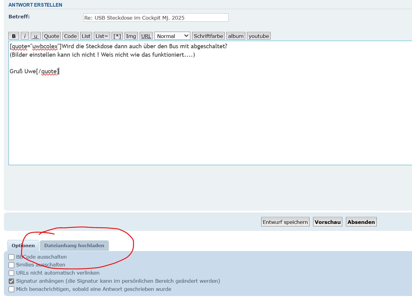"Dateianhang hochladen" wählen, Bild heraussuchen und hochladen. Dann steht das Bild unter
